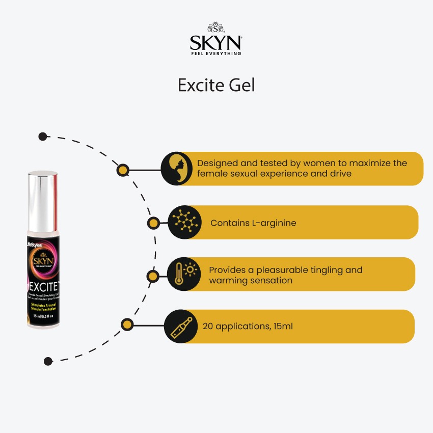 SKYN® Excite Gel combines high quality ingredients which, when used with the suggested massage technique provides a more exciting experience! It provides a pleasurable tingling and warming sensation.