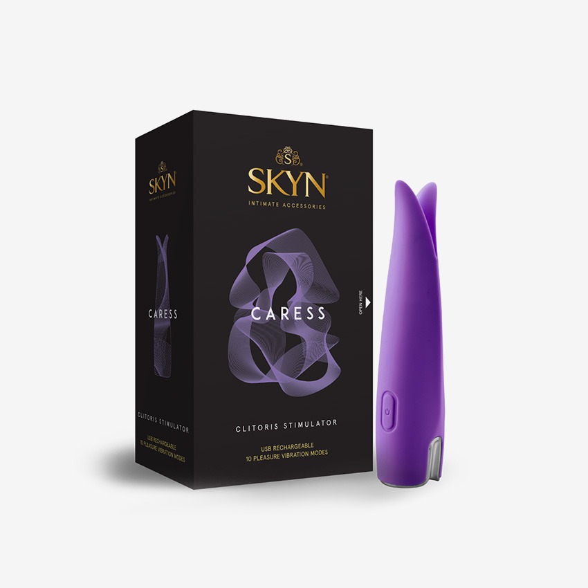 Discover true pleasure with the SKYN™ Caress clitoral stimulator. Designed to mimic the feeling of oral stimulation by featuring vibrating open ends with an ultra soft finish, this is the ultimate pleasure partner. USB rechargebale battery works up to 2 hours when fully charged. Water resistant and compatible with water based lubricants.