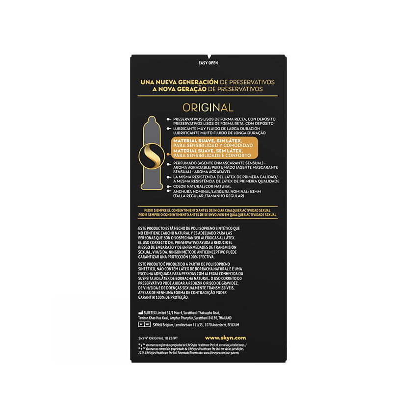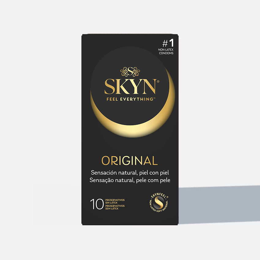 «Los condones SKYN están hechos con SKYNFEEL®, un material de poliisopreno tecnológicamente avanzado que está completamente libre de látex de caucho natural.