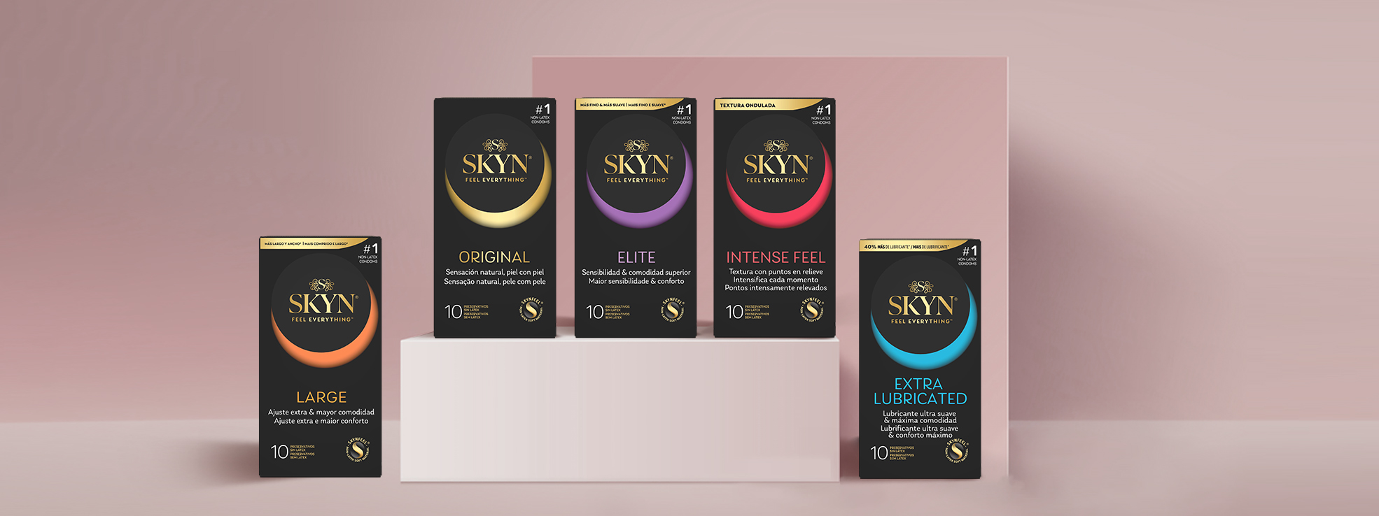 Los condones SKYN están fabricados con SKYNFEEL®, un material revolucionario que es notablemente más suave y que proporciona una sensación más natural que los condones normales. Nuestros condones ofrecen la misma protección contra el embarazo y las ETS, añadiendo la máxima suavidad, y además son adecuados para las personas alérgicas al látex.