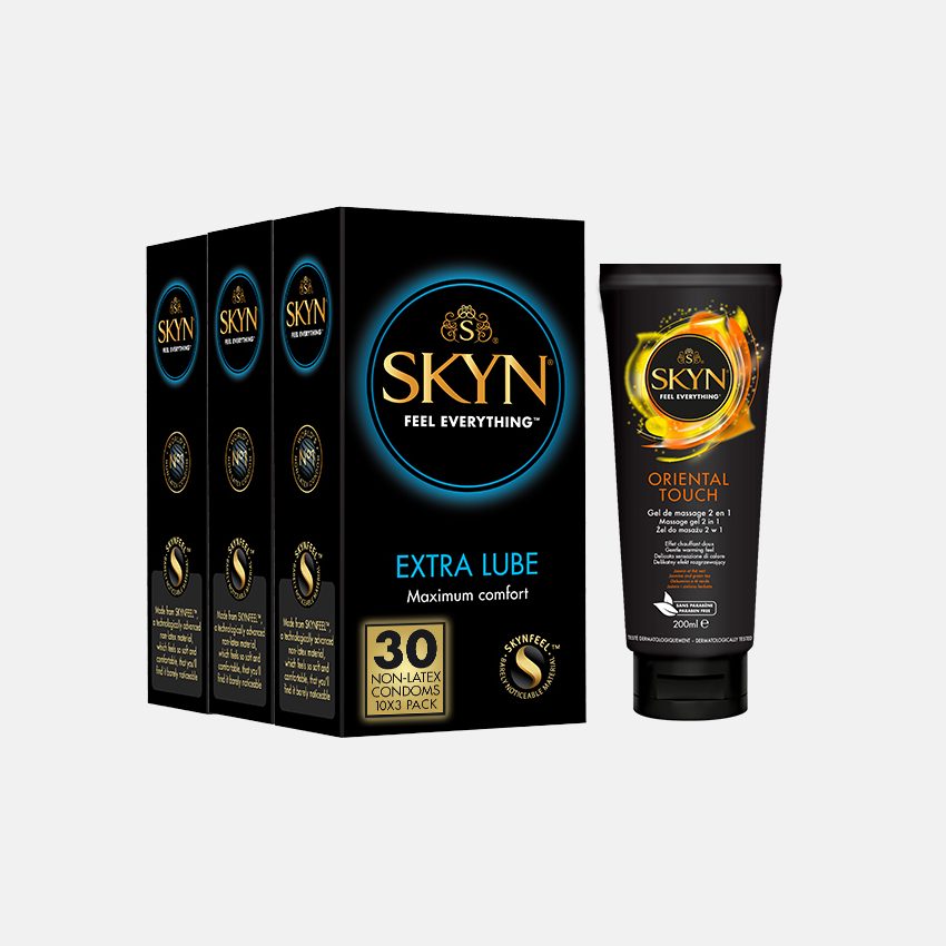 Inclus : 3 boîtes de 10 préservatifs SKYN Extra lubrifié + 200 ml de gel de massage SKYN Oriental Touch