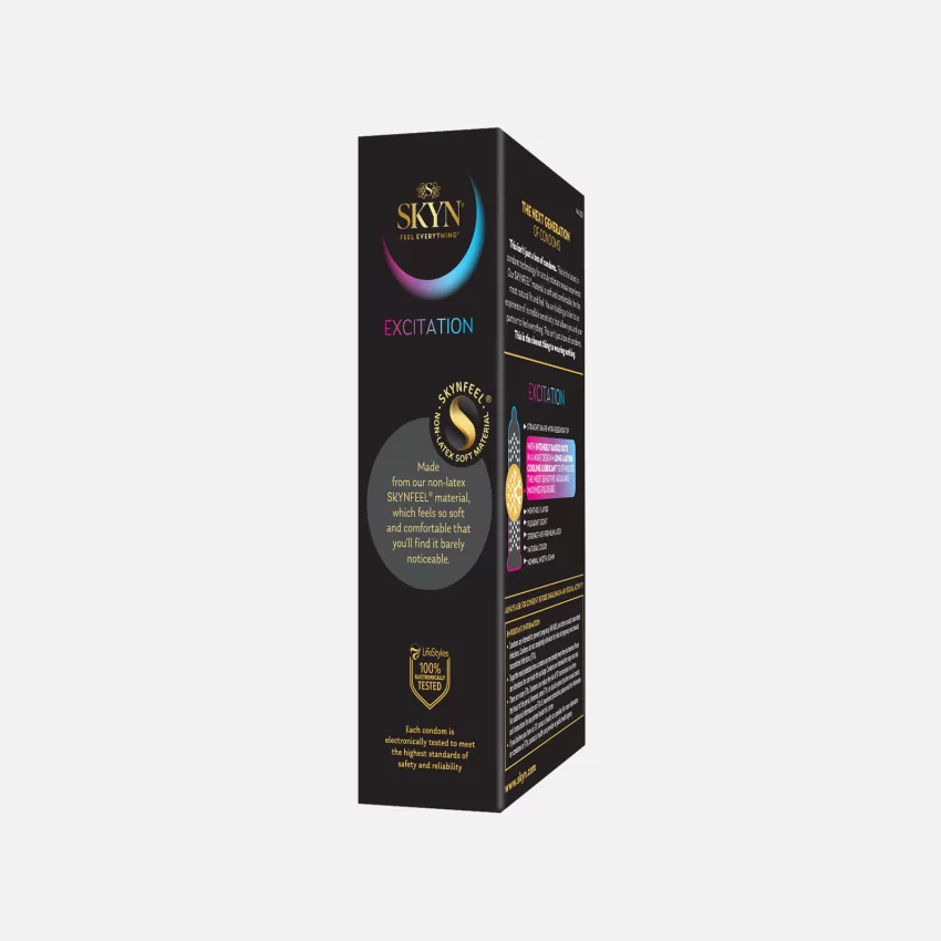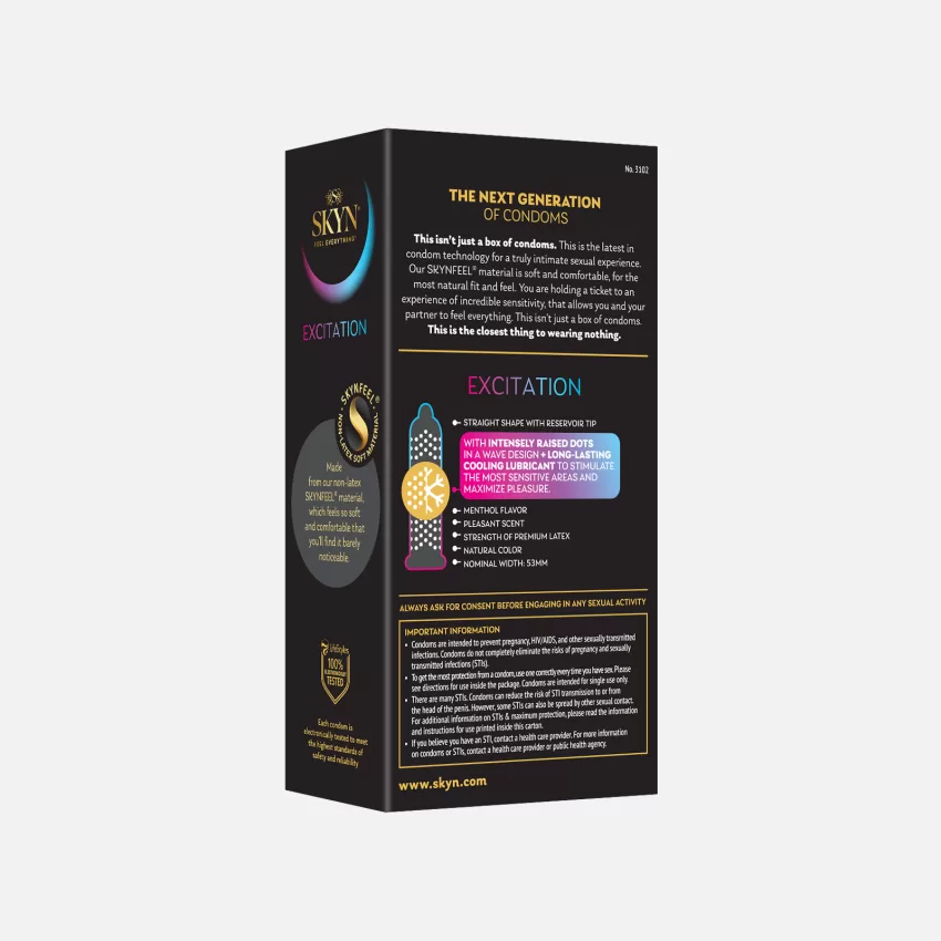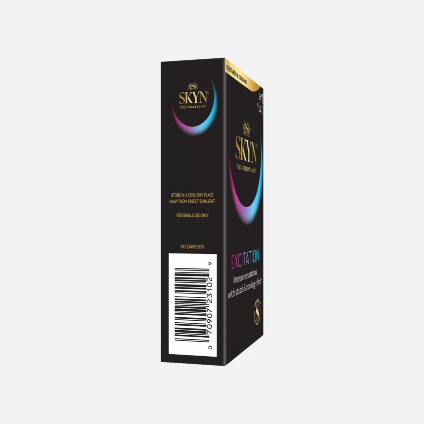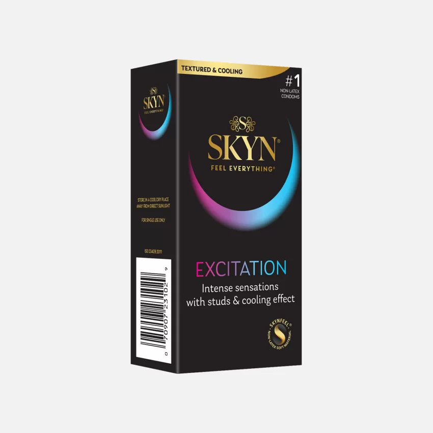 SKYN Excitation condoms have a unique wave design texture with intensely raised dots on the most sensitive areas. They are also lubricated with long-lasting and ultra-smooth cooling lubricant, menthol flavoured, to maximise stimulation and pleasure for both partners.