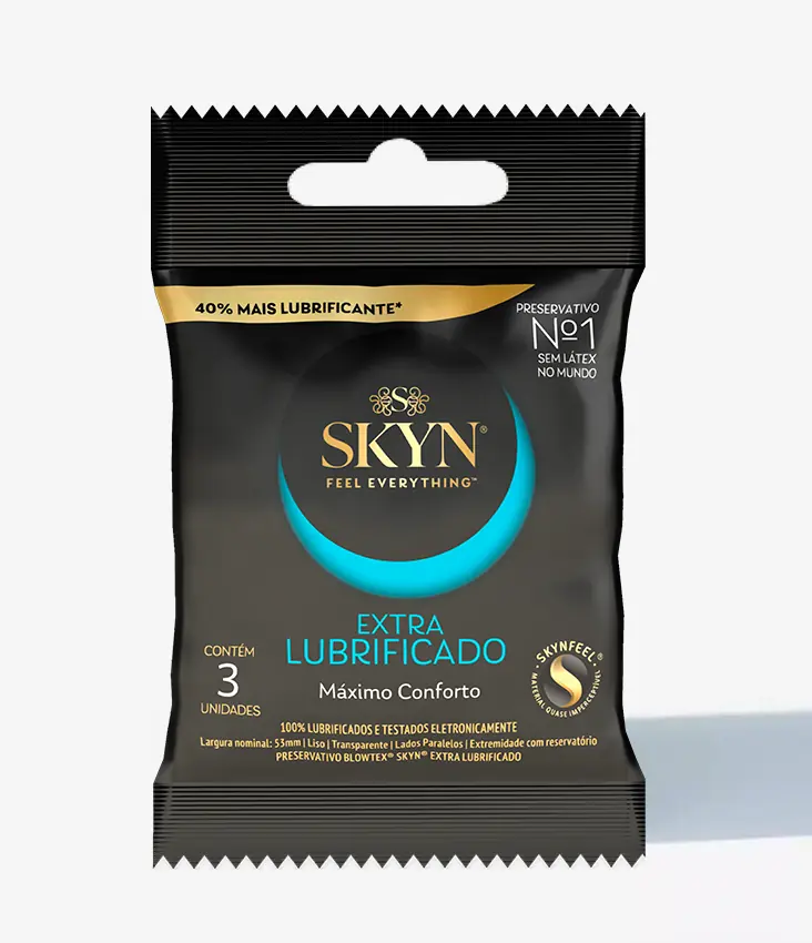 O preservativo SKYN® Extra Lubrificado conta com 40% de lubrificação extra em comparação com SKYN® Original.