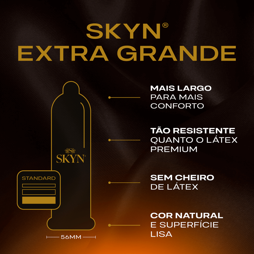 Com largura nominal de 56 mm, SKYN® Extra Grande é mais largo que nosso preservativo padrão e oferece maior conforto.