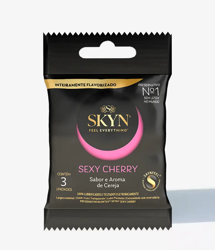 Preservativo sem látex, produzido com a tecnologia SKYN®FEEL®, oferece sabor e aroma de cereja por toda a sua extensão, proporcionando uma experiência íntima mais sensual e prazerosa.​