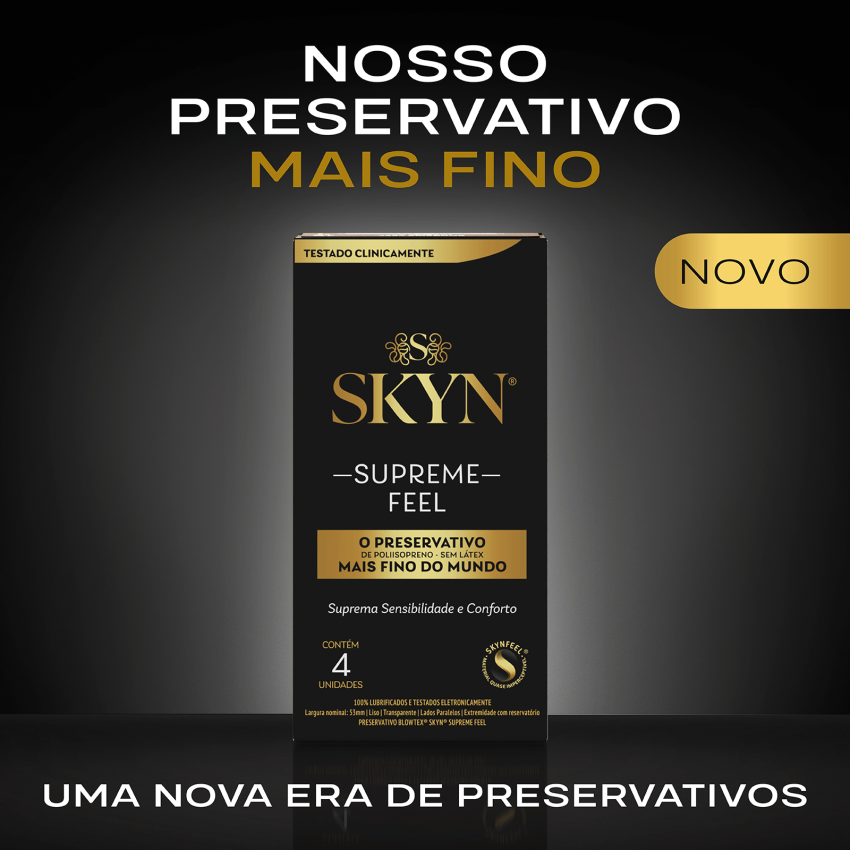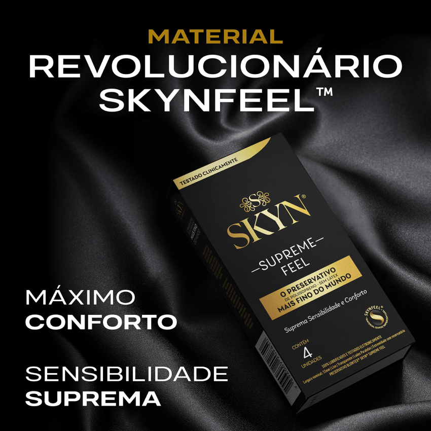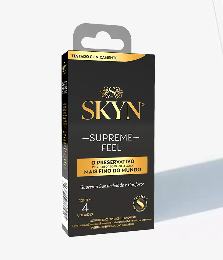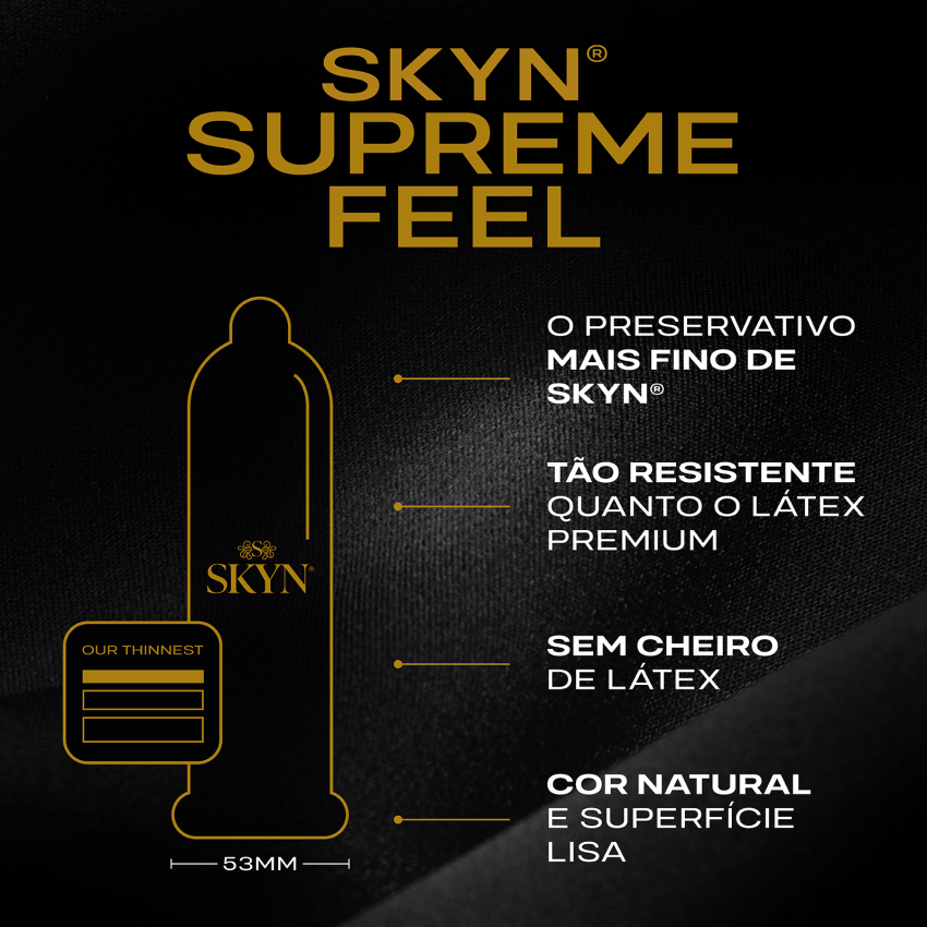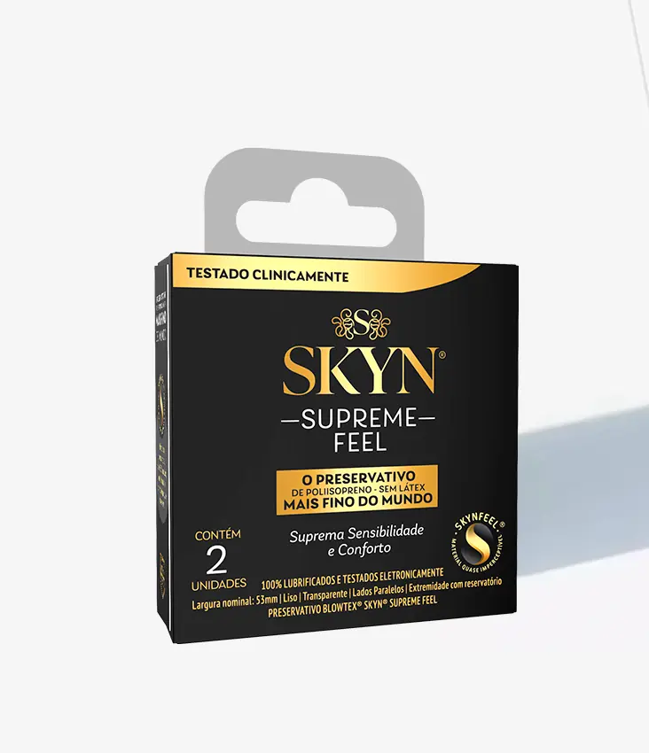 SKYN® Supreme Feel, o preservativo mais fino da linha SKYN®. Sinta 2x mais transferência de calor entre os parceiros. Faça upgrade para a sensação suprema de sensibilidade e conforto.