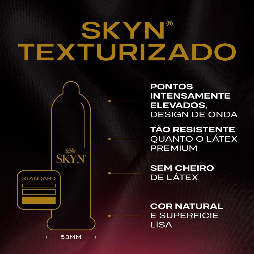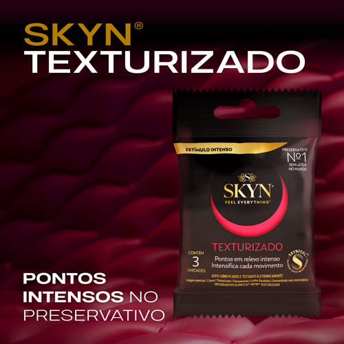 SKYN® Texturizado eleva a experiência íntima. As texturas de bolinhas presentes na parte externa do preservativo ajudam no estímulo durante o ato sexual, intensificando o prazer.